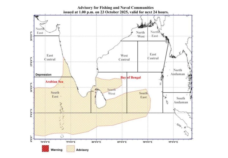 According to the latest report, the Depression over the southeast Arabian Sea moved slowly north-northeastwards at a speed of around 3 kmph during the past six hours. As of 0000 UTC on 23 October 2025, it was centered near latitude 9.7°N and longitude 67.7°E.