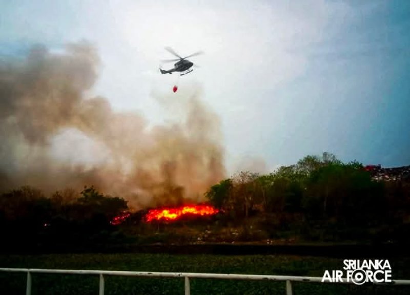 The Sri Lanka Air Force (SLAF) carried out aerial firefighting operations using a Bambi Bucket, a specialized device used to scoop and drop large volumes of water over fire-affected areas. The helicopter conducted multiple sorties, drawing water from nearby sources and releasing it over the burning sections of the dump to contain the flames.