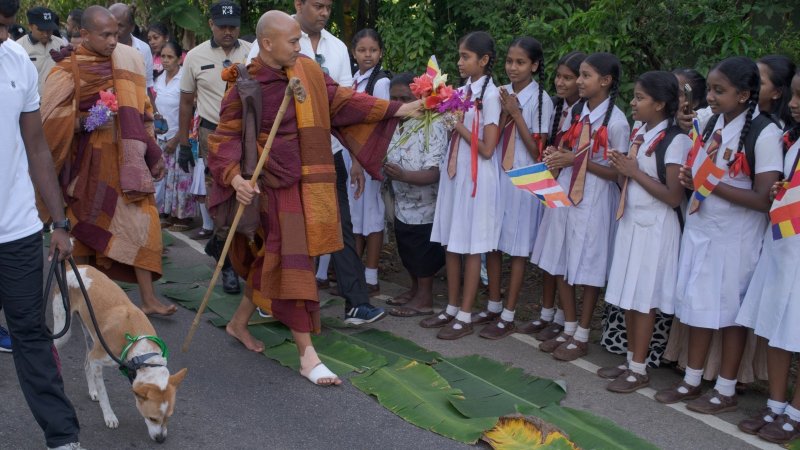 The peace march began yesterday morning (26) from Tholangamuwa National School and reached Yakkala Abesekararamaya by night. Organizers and devotees took special measures to reduce the discomfort caused by the heated roads, laying banana leaves and cloth along the road to support the participating Buddhist monks.