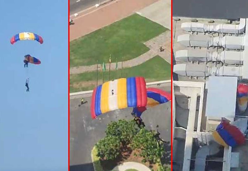 Troopers became entangled during the rehearsal, resulting in two crashing onto the rooftop of the Shangri-La Hotel, while another landed on the ground.